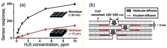 (a) Sensor response of monolayer- and multilayer-based sensors to H2S; (b) Model of a multilayer film with lamellar structure. Reproduced from []. Published 2019 by ACS as open access.