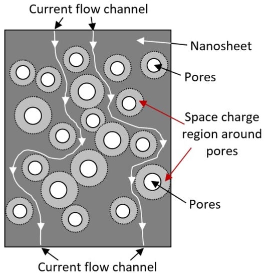Third, the appearance of pores in nanoflakes and nanosheets makes it possible to form a conductive network in them, which enhances the influence of the atmosphere on the resistance of 2D nanoflakes and nanosheets. This effect is associated with the formation of space charge regions around the pores, which, when the gas atmosphere changes, can also participate in the modulation of the conductivity of nanoflakes and nanosheets (see Figure 4). In this case, the maximum effect should be achieved at a distance between the pores comparable to the Debye length. This makes it possible to block the conduction channels between the pores even at nanosheet thicknesses significantly exceeding the Debye length. A similar effect is often used to explain the increased sensitivity of gas sensors based on porous metal oxide [,,,,]. This means that high sensitivity of the sensors can be achieved even with a large thickness of nanoflakes and nanosheets, which cannot be obtained using monolithic (nonporous) nanoflakes and nanosheets. For example, Duy et al. [], Chen et al. [], and Choi et al. [] have shown that gas sensors based on porous 2D nanostructures can indeed have high sensitivity even at nanosheet thicknesses of 80–100 nm.