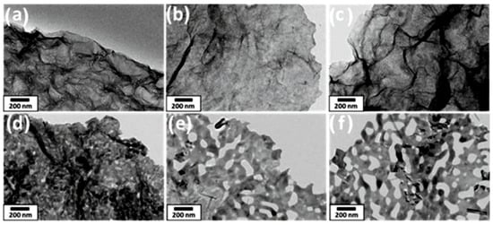 TEM images of MnO2 nanosheets after annealing in air at different temperatures: (a) as-synthesized, (b) Tan = 300 °C, (c) Tan = 400 °C, (d) Tan = Tan = 500 °C, (e) Tan = 600 °C, (f) Tan = 700 °C. Reprinted with permission from Adpakpang et al. []. Copyright 2018: Wiley.