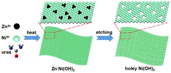 This method is based on chemical etching, which makes it possible to remove some of the atoms of a certain type from the compound and form nanoholes due to ongoing structural changes (see Figure 7). The main problem of this method is the selection of appropriate easily-soluble components, their inclusion in metal oxides or oxyhydroxides in which pore formation is necessary, and the creation of conditions for their selective etching. At present, this approach is usually implemented by introducing Zn(II), Al(III), Ga(III), Cr(III), or Na cations into the composition of NSs at the stage of their synthesis, followed by their dissolution in an alkaline medium. An example of the implementation of this method is the process of nanopore formation in Ni(OH)2 NSs proposed by Kong et al. []. For chemical dissolution of Zn in Ni(OH)2:Zn, NSs were treated in 5 M NaOH solution heated to 85 °C for 30 min. As a result, nanoholes up to 5 nm in diameter were formed in such NSs. The same approach was taken by Lu et al. [] for the formation of holey LiCoO2 nanosheets. The formation of pores occurred due to the extraction of lithium from LiCoO2 during acid etching.