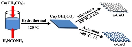 The designed synthetic route of the c-CuO and a-CuO porous nanosheets. Reprinted from Tian et al. []. Published 2020 by Wiley as open access.