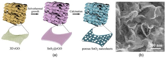 (a) Schematic diagram of the synthesis procedure and (b) SEM image of porous SnO2 nanosheets. Reprinted with permission from Huang et al. []. Copyright 2022: Elsevier.