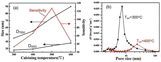 (a) Effect of annealing on crystallite size (DTEM and DXRD) and sensitivity of sensors based on porous ZnO nanoflakes. Reprinted with permission from []. Copyright 2011: RSC; (b) Pore−size-distribution curves of 3D hierarchical ZnO porous structure after annealing at 300 °C and 400 °C. Reprinted with permission from []. Copyright 2015: Elsevier.