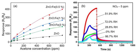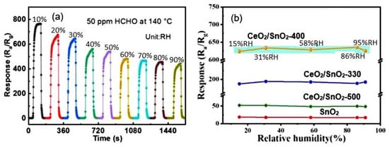 The typical effect of humidity on the conductometric response of various 2D-based sensors is shown in Figure 16a. It can be seen that the influence of humidity can be significant, and this influence cannot be neglected if the sensor is designed to measure gas concentration. However, the experiment showed that with appropriate calibration and independent measurement of the air humidity, the effect of humidity could be compensated by the electronic method []. If the structure and composition of the gas-sensitive material are optimized to reduce the influence of humidity (Figure 16b), and the sensor is used in alarm systems, then, with sufficient sensitivity of the sensors to the detected gas, the influence of humidity can be neglected. This is exactly the situation we have with the CeO2/SnO2 sensors developed by Zhu et al. []. It is believed [] that the humidity-independent property of CeO2/SnO2 sensors is mainly attributed to the presence of cerium oxide. CeO2 nanoparticles can be considered an absorber of hydroxyl groups due to a facile redox reaction (Ce3+/Ce4+) [,].