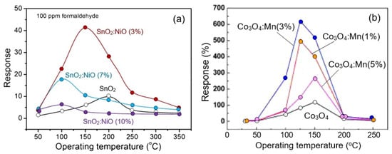 (a) Response of sensors based on SnO2 and SnO2 doped with NiO nanoflowers to 100 ppm formaldehyde. Adapted with permission from []. Copyright 2018: Elsevier. (b) The responses of bare Co3O4 and Co3O4 nanosheets doped with Mn to 100 ppm CO at different temperatures. Reprinted with permission from Qin et al. []. Copyright 2022: Elsevier.