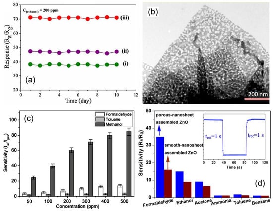 - Liu, J.; Guo, Z.; Meng, F.; Luo, T.; Li, M.; Liu, J. Novel porous single-crystalline ZnO nanosheets fabricated by annealing ZnS(en)0.5 (en=ethylenediamine) precursor. Application in a gas sensor for indoor air contaminant detection. Nanotechnology 2009, 20, 125501. [Google Scholar] [CrossRef] [PubMed]