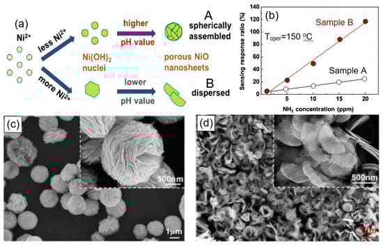 However, as follows from the results presented in [], it is not always clear what determines the change in sensor parameters—a change in the size and density of pores or a change in the electrical and surface properties of metal oxides under the influence of heat treatment. In particular, Feng et al. [] found that the maximum response of sensors based on porous NiO nanosheets to N2H4 at 92 °C was observed after annealing at 700 °C. At the same time, if at a temperature of 500 °C the nanosheets had a mesoporous structure with a large number of pores, then, as the calcination temperature increased to 600 °C, the pore size on the surface of the NiO nanosheets became larger. When the calcination temperature reached 700 °C, the pore size became much larger, and only a few large pores remained on the surface of the nanosheets. Upon reaching the calcination temperature of 800 °C, the NiO nanosheets melted and were destroyed. The described behavior of the nanosheet morphology indicates that the observed change in the parameters of sensors based on NiO NSs during annealing is more consistent with the effect of heat treatment on the bulk and surface properties of NiO.