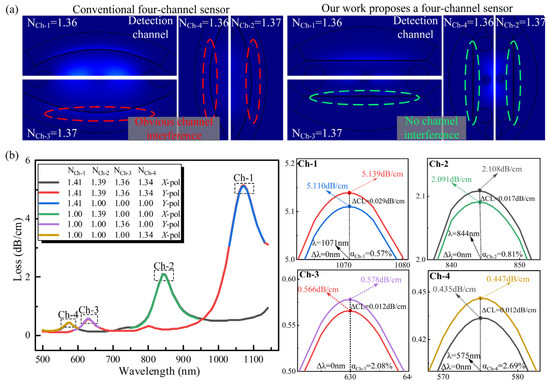 Figure 3b shows the multi-channel detection analysis. First, we added analytes with refractive indices of NCh-1 = 1.41, NCh-2 = 1.39, NCh-3 = 1.36, and NCh-4 = 1.34 in Ch-1, Ch-2, Ch-3, and Ch-4 simultaneously and detected them with X-pol light and Y-pol light, respectively, and obtained the corresponding loss spectra. Then we added the corresponding analytes to one channel only, and the other channels did not have any added analytes. The above method was used to compare and analyze the interference when multiple channels were detected simultaneously. The ΔCL indicates the amount of change in resonance loss in both cases. The α is the percentage of ΔCL over the loss of one channel, which indicates the interference of simultaneous detection of multiple channels to a single channel. From Figure 3b, it can be obtained that the Δλ of all four channels is 0, which indicates that there is no change in the RW between simultaneous detection of multiple channels and independent detection of a single channel. From the loss point of view, the larger the RI of the analyte, the smaller the interference between multiple channels, when the RI of the analyte takes the minimum value of 1.34, the maximum interference between multiple channels only accounts for 2.69% of the single channel detection loss. The above data can prove that our proposed sensors have less mutual interference when detected simultaneously.