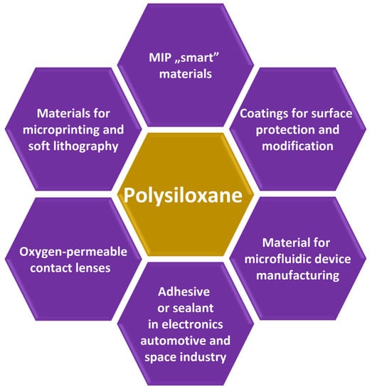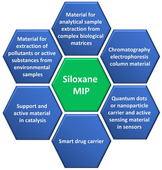 The utilization of the molecularly imprinted technology to organosilicones, such as siloxanes (and polysiloxanes), could significantly enhance the application capabilities of the latter materials. It should be pointed out that siloxanes have found countless and diverse applications, not only in biomedicine and pharmaceutical fields [69] but also in personal care products and cosmetics due to the non-toxicity and biocompatibility of siloxane compounds [70], as well as other areas, such as electronic manufacturing, automotive industry, textile products, construction materials, medical equipment, and food processing (Figure 1) [69,71,72,73,74,75,76,77,78,79]. It has to be underlined that such broad application capabilities of siloxanes are possible because of their extraordinary properties such as flexibility and rubber-like elasticity, fracture toughness, mechanical and chemical durability, thermal stability, compressive strength, optical transparency, and amphiphilicity, among others [80].