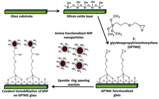 A very interesting approach was proposed by Kamra and co-workers [134], who proposed covalent immobilization of propranolol-imprinted polymer nanoparticles using an epoxy-derived siloxane (Figure 3). The nucleophilic substitution after the epoxide ring opening was enabled due to the presence of allylamine residues on the surface of molecularly imprinted particles. It was proved that covalent bonds between functionalized siloxane and imprinted nanoparticles significantly improved the stability and analytical performance of the sensor. It was stated that the method was applicable to various amine functionalized materials for lab-on-chip and other sensing applications and could be easily extended to other imprinted materials without deterioration of their specificity.
