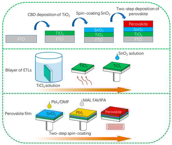 Schematic illustration of the bilayer of ETLs (TiO2 and SnO2 films) and perovskite films fabricated by chemical bath deposition and spin-coating.