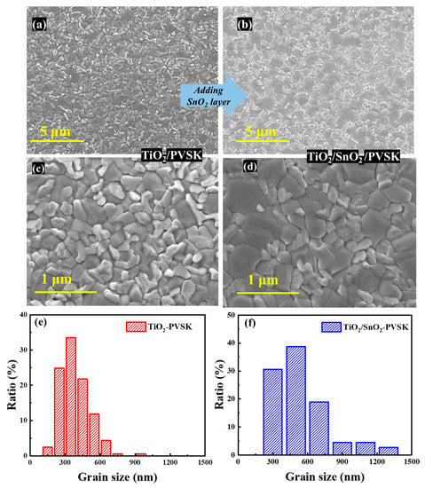 (a) Top-view SEM images of monolayer TiO2-ETL PSCs and bilayer TiO2/SnO2-ETL PSCs (a–d), and their corresponding statistic of grain size (e,f).