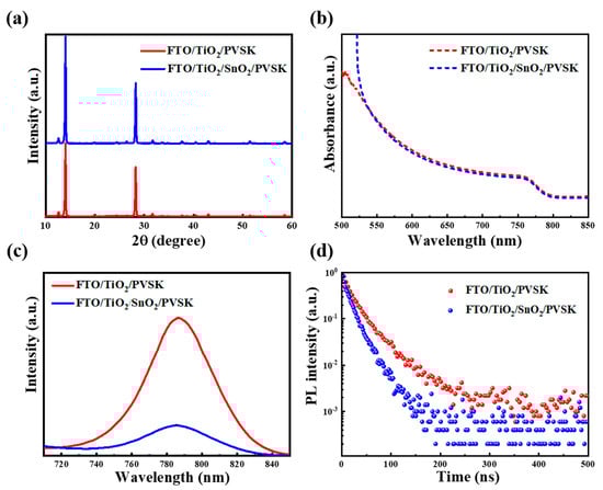 In addition, the steady-state photoluminescence (PL) and time-resolved photoluminescence (TRPL) experiments were carried out to investigate carrier transport behavior. As seen in Figure 3c,d, the faster PL quenching of the perovskite thin film on the TiO2/SnO2 substrate indicates an enhanced electron extraction capability [28]. Moreover, the lifetimes of the corresponding perovskite thin films were fitted by a biexponential decay function [29,30]. The lifetime of the TiO2/SnO2-based sample is 15.4 ns, which is shorter than that of the TiO2-based sample (22.2 ns), indicating a faster carrier extraction from the perovskite thin film to TiO2/SnO2 electron transport layer [31].