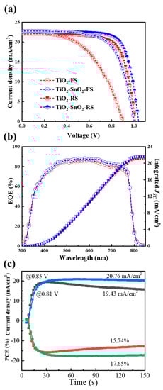 Figure 4a,b shows the cross-section SEM images of devices fabricated on TiO2 and TiO2/SnO2 substrates. The uniform and dense perovskite absorber layers not only ensure the light harvest, but also effectively impede the carrier recombination in the devices. The current density-voltage (J-V) curves of the devices were measured under standard AM 1.5 G illumination and are shown in Figure 5a and Table 1, while the key performance parameters of open-circuit voltage (VOC), short-circuit current (JSC), fill factor (FF), power conversion efficiency (PCE) and their statistical analyses are displayed in Figure 6a–d and Table 2, respectively. The PCE of 16.16% (VOC = 1.012 V, JSC = 22.06 mA/cm2 and FF = 72.4%) and 10.37% (VOC = 0.905 V, JSC = 22.06 mA/cm2 and FF = 51.9%) under reverse scan (RS) and forward scan (FS) indicate large hysteresis in the TiO2-based devices. In contrast, the high PCE of 17.64% (VOC = 1.041 V, JSC = 22.58 mA/cm2 and FF = 75.0%) and 15.29% (VOC = 1.001 V, JSC = 22.73 mA/cm2 and FF = 67.2%) under RS and FS were obtained for TiO2/SnO2-based solar cells. The improved efficiency of TiO2/SnO2-based solar cells can be attributed to a higher crystallinity of perovskite grains, which enhances light capture and reduces the defects at grain boundaries [14,25]. The EQE spectra of the corresponding devices were presented in Figure 5b. The improved EQE in the short wavelength in terms of TiO2/SnO2-based device indicates faster carrier extraction and reduced recombination at the TiO2/SnO2/PVSK interface [32]. Similarly, the enhanced EQE at the long wavelength region also suggests that reduced defects and carrier recombination in the perovskite bulk film, which can be explained by the enlarged grain size and improved crystallinity of the perovskite grains [32]. As a result, the integrated JSC from EQE of the TiO2/SnO2-based device is 21.59 mA/cm2, which is higher than that of the TiO2 based device (21.17 mA/cm2). Furthermore, the TiO2/SnO2-based device exhibited a stable output (under initial maximum power point (MPP) voltage) with a PCE of 17.65%. In contrast, the TiO2 based solar cell shows a poor output under MPP, yielding a low PCE of 15.74% (Figure 5c). More importantly, the hysteresis (hysteresis index (HI) = PCERS/PCEFS) of the TiO2/SnO2-based devices is also reduced, compared to TiO2-based devices [32,33,34]. The HI of the TiO2-based PSC is 1.56, which is decreased to 1.15 by incorporating SnO2 into devices to construct the TiO2/SnO2 bilayer ETL. Compared to TiO2 based devices with a large hysteresis of 1.51, the improved efficiency and reduced HI of 1.18 for TiO2/SnO2-based PSCs indicates the bilayer ETL can improve the reproducible fabrication and the device performance.