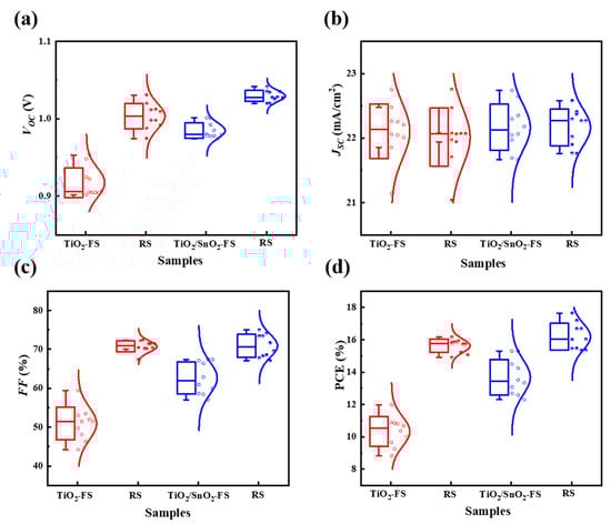 Statistical distribution of TiO2 and TiO2/SnO2 based PSCs (10 devices). (a) VOC, (b) JSC, (c) FF and (d) PCE.