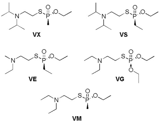 V-series nerve agents are lethal organophosphorus compounds that can inhibit acetylcholinesterase present in the central nervous system. The inactivation of acetylcholinesterase results in the accumulation of acetylcholine in the synapse, which can lead to neuromuscular paralysis and, finally, death [1,2,3]. These nerve agents display a potential threat to the community due to their physical properties (odorless, colorless, high volatility), higher toxicity, facile synthesis, and rapid action [4]. V-series nerve agents are devastating weapons used by terrorists due to their dispersive and highly lethal nature [5,6]. For the last two decades, V-type nerve agents have been used in various terrorist attacks [7,8,9,10,11].