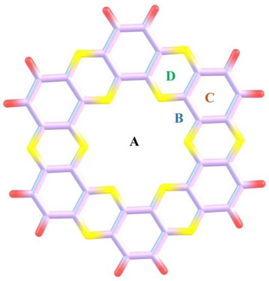 The optimized C2N quantum dot is shown in Figure 2. C2N consists of alternate pyrazine and benzene rings. In C2N material, the presence of an electron-rich nitrogenated cavity might help in the adsorption of analytes and thus make them suitable candidates for sensing studies against CWAs. The C2N surface consists of four appropriate binding sites; A; the center of C2N surface, B; triangular region made by C-N atoms, C; at the top of benzene rings and D; is over pyrazine rings (see Figure 2) [71,72].