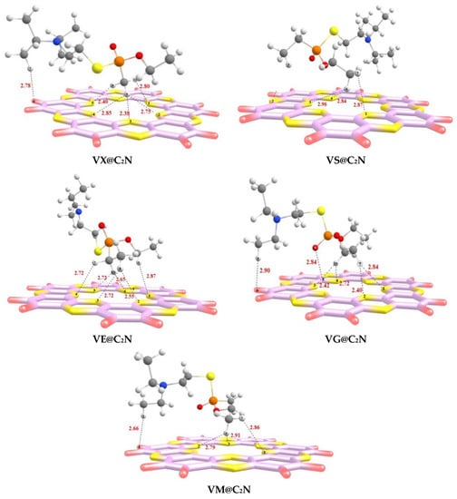 Interaction distance and energy (Eint) are two important parameters for real estimation of interaction behavior [73]. The bond interaction distance decreases when the analyte approaches the surface (C2N) for complexation. Interactions existing between V-series nerve agents and C2N surface are attributed to the minimum interaction distance, which can be understood via interaction energy. We have presented interaction distances for all complexes (V-series@C2N) along with corresponding interaction energy in Table 1.