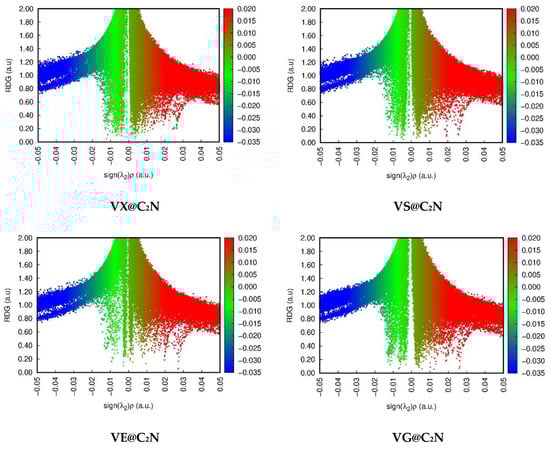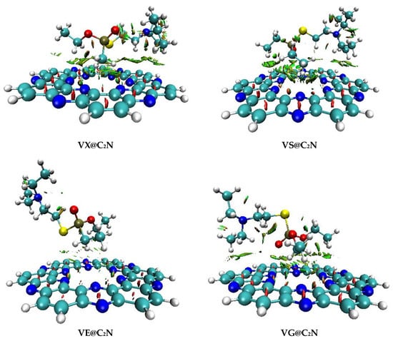 The 2D-RDG graphs and colored 3D isosurfaces are presented in Figure 4 and Figure 5, respectively. In NCI analysis, the colored map reveals the appearance of a green isosurface between C2N surface and V-series nerve agents, which indicates the existence of weak van der Waals interactions. The 3D green isosurfaces in the case of VG@C2N, VM@C2N, and VX@C2N complexes are more prominent as compared to the other two complexes, which shows the stability of these complexes, which is in accordance with the results of interactions energy. Furthermore, 2D-RDG plots depict that the projection of scattered green spikes in all V-series@ C2N complexes appears in the range of 0.00 a.u. to −0.015 a.u., which confirms weak van der Waals interactions in all complexes. The existence of steric repulsion in all complexes is also confirmed through red-colored 3D isosurfaces, which are observed in the center of pyrazine and benzene rings of the C2N unit (Figure 4).