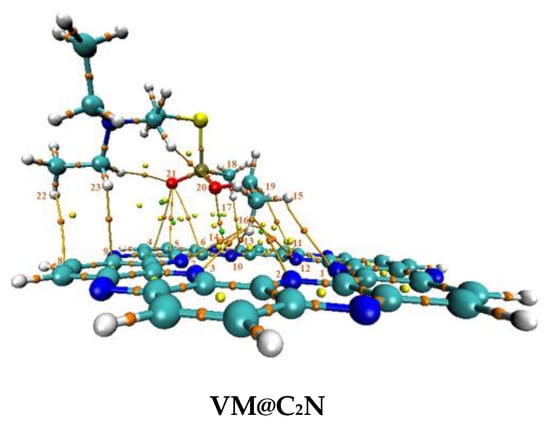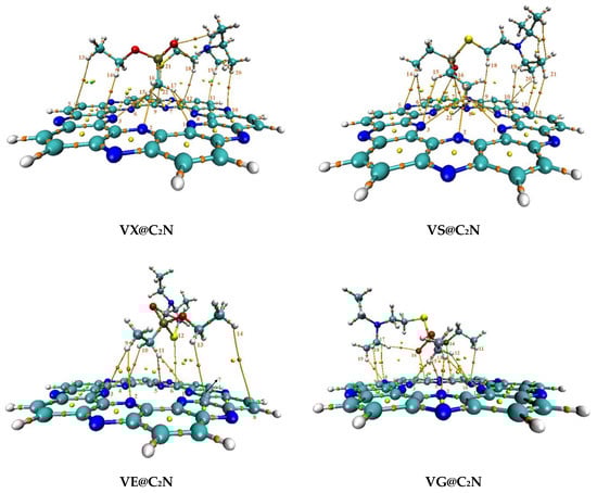QTAIM analysis of studied V-series@C2N complexes and yellow lines between nerve agent molecules and C2N sheet indicates bond paths, whereas orange-colored dots present on bond paths show the bond critical points (BCPs).