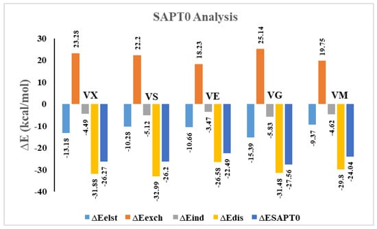 Hence, SAPT0 total consists of the sum of these four contributing factors, i.e., ΔEind, ΔEdisp, ΔEelstat, and ΔEexch, which stabilizes V-series nerve agents with C2N upon complexation [66]. Among these components, ΔEdisp, ΔEelstat, and ΔEind are attractive forces, whereas the ΔEexch factor is a repulsive force.