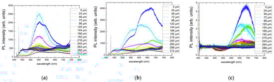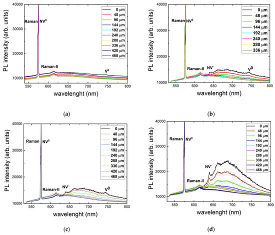 Three-dimensional scanning confocal RT PL microspectroscopy at 532 nm in the unexposed diamond region indicates a weak structureless composition of NV0 and NV− bands (Figure 2a) with almost constant intensity regardless of the probing depth of 0–480 μm inside the sample. This indicates that, at least, the sample is rather homogeneous in this spatial region regarding the optical center probed in the PL spectral range, and the microspectroscopy provides truly confocal probing without artefacts of considerable sample absorption of the 532 nm CW laser pump or PL emissions.