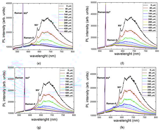 RT 532 nm excitation PL spectra at different depths in μm inside the sample (frames) for an exposure time of 240 s (24 M pulses) and different incident 0.3 ps laser pulse energies (μJ): 0/background (a), 0.4 (b), 0.6 (c), 0.8 (d), 1.0 (e), 1.2 (f), 1.4 (g), and 1.6 (h). Spectral assignment after [].