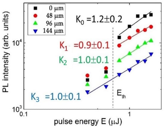 Peak intensity of the NV− band at 685 nm at different depths versus incident 0.3 ps laser pulse energy in log–log coordinates as well as the linear fitting lines of these curves with their slopes, K0 (depth—0 μm), K1 (depth—48 μm), K2 (depth—96 μm) and K3 (depth—144 μm), and the threshold energy, Eth.