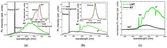 More detailed analyses of RT and LNT PL spectra acquired at a depth of 100 μm for a pulse energy of 1.6 μJ and an exposure time of 240 s (24 M pulses) show no NV0 ZPL and very minor intensity in the related spectral region of >575 nm in both the background and micromark PL spectra at LNT (Figure 4). In contrast, RT PL spectra indicate the presence of NV0 ZPL in both the background and micromark emissions. Moreover, NV− ZPL appears only in the RT and LNT PL spectra of the micromarks, but not for the background. Finally, the V0 peak remains only under LNT PL acquisition in both the background and micromark emissions. These data indicate some RT lability of vacancies, the possible RT ionization of NV− centers to NV0 ones, and the absence of NV− centers in the background at both RT and LNT.