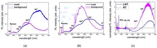 RT (a) and LNT (b) 532 nm PL spectra of the background, micromarks, and their normalized intensity (c) for an exposure time of 240 s (24 M pulses) and an incident 0.3 ps laser pulse energy of 1.6 μJ. Spectral assignment after [].