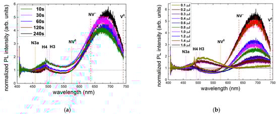 Normalized RT 405 nm PL intensity spectra acquired at a depth of 20 μm at different laser exposures of 1–24 M pulses ((a) pulse energy—1.6 μJ) and energies in the range of 0.1 to 1.6 μJ ((b) an exposure time of 240 s—24 M pulses). Spectral assignment after [].
