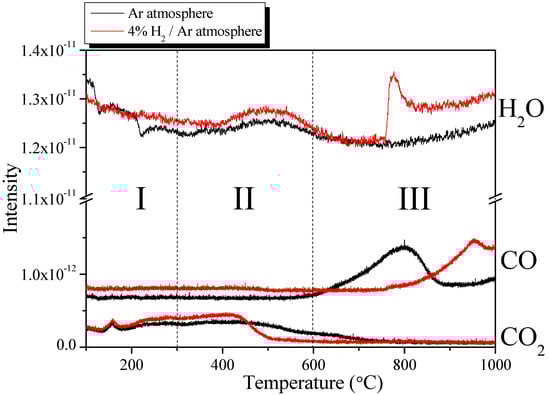 The intensity of the CO signal under the inert atmosphere increased sharply up to 800 °C, decreased thereafter, and then increased again from 900 °C. By contrast, the intensity of the CO signal under a hydrogen atmosphere increased from 800 °C. The CO2 signal under the inert atmosphere continuously decreased and was not observed above approximately 800 °C, whereas that under the hydrogen atmosphere was not observed in Stage 3.