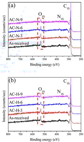 XPS survey spectra of AC heat-treated under different conditions; (a) AC-N, (b) AC-H.