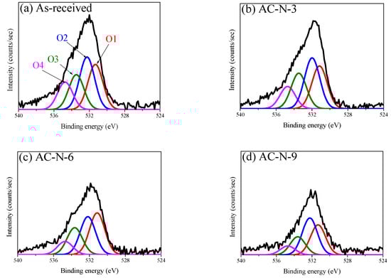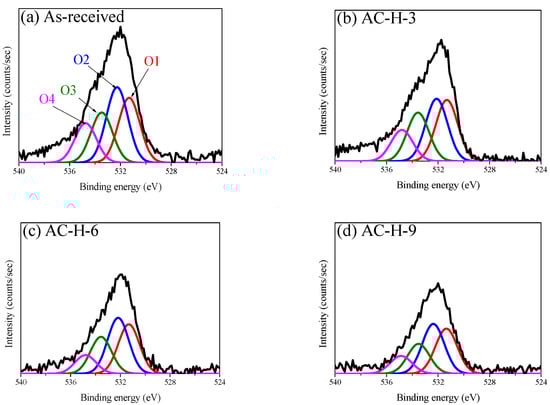 The changes in the OFGs formed in AC according to the heat-treatment conditions were examined by X-ray photoelectron spectroscopy (XPS, PHI 5000, Versa Probe II, Japan). The X-ray anode was operated at >5 W, and the high voltage was maintained at 5.0 kV. The energy resolution was fixed at 0.50 eV. The pressure of the XPS analysis is on the level of 1.3 × 10−6 Pa. The peak in the O1s spectra were curve-fitted into four peaks: O1 (531.3 eV); O2 (532.3 eV); O3 (533.3 eV); and O4 (534.7 eV) with a Shirley baseline and Gauss–Lorentz function [21,22,23,24]. The center value and FWHM of four peaks (O1–O4 peak) were fixed during XPS fitting.