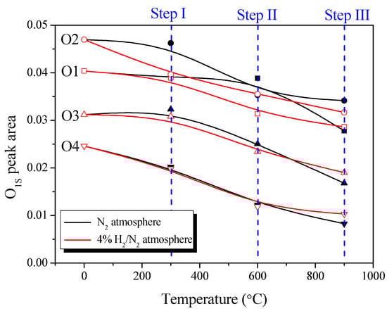 In contrast to the O1 and O2 peaks, the O3 and O4 peaks were similar between the different gas atmospheres, indicating that O3 and O4 were more significantly affected by the decomposition temperature than the gas atmosphere.