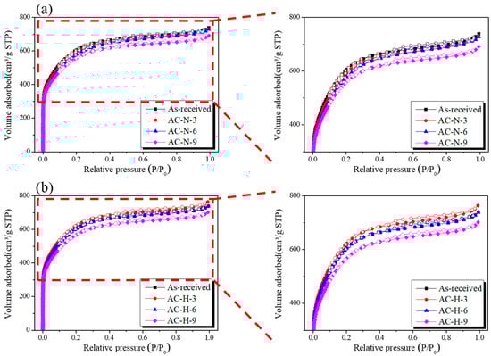 The N2/77 K isotherm adsorption–desorption curve, which is the most effective method for analyzing the pore characteristics of AC, was used to investigate the changes in the pore characteristics of the AC according to the heat-treatment conditions. Figure 6 shows the N2/77 K adsorption–desorption curves of AC-N and AC-H. The N2/77 K adsorption–desorption curves are divided into eight types according to the International Union of Pure and Applied Chemistry (IUPAC) standards [31], thereby allowing the pore characteristics of the adsorbent to be analyzed according to the shape of the curve. As shown in Figure 6, all of the isothermal adsorption curves of the AC had the form of Type I(b) according to the IUPAC standards [31], indicating that micropores and mesopores developed simultaneously in all AC samples.