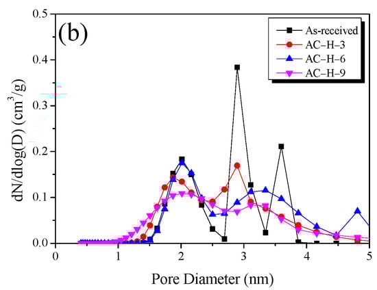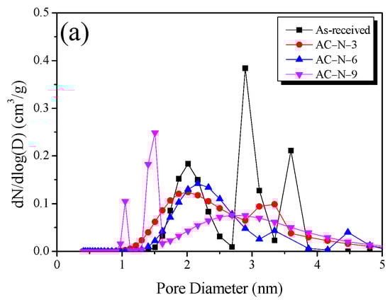 PSD curves based on NLDFT are useful for analyzing the pore distribution of AC. Figure 7a,b shows the PSD of AC-N and AC-H, respectively. AC-N and AC-H exhibited different change behaviors of the PSD according to the OFG removal process. As shown in Figure 1, the OFGs are decomposed by different mechanisms depending on the gas atmosphere. As the temperature increased, the OFGs at the grain edges were removed as CO and CO2 under the inert atmosphere, resulting in the oxidation of grain edges and increased pore diameter via pore drilling. Accordingly, the pore diameter and mesopore volume increased even though only heat-treatment was performed under inert and hydrogen atmospheres. For the AC-N heat-treated under the inert atmosphere, the pore diameter and mesopore volume increased significantly as the heat-treatment temperature increased. In particular, the substantial generation of CO at 800 °C shown in Figure 1 significantly promoted the etching reaction at the grain edges, thereby reducing the volume of pores with diameters of <2 nm in the PSD of AC-N-9. However, in AC-N-9, the formation of micropores (with diameters of <1.5 nm) was observed together with >30% burn-off, as well as significant etching reaction at the grain edges, indicating that new micropores were formed inside the pores.