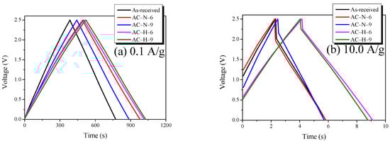 As shown in Figure 8a, all AC samples had symmetric charge and discharge curves, and small IR drops were observed. These results indicated that all AC samples had low inner resistances owing to the typical EDLC charging/discharging behavior based on the non-Faradic process, as well as excellent pore characteristics, with specific surface areas of >2000 m2/g. By contrast, as shown in Figure 8b, the ohmic resistance of the system increased as the current density was increased to 10.0 A/g. Thus, the IR drop of the GCD curve was clearly observed. The largest IR drops were observed for the as-received and AC-N-6 samples, followed by AC-N-9, AC-H-6, and AC-H-9. This trend indicated that a higher thermal decomposition temperature corresponded to a lower OFG content of AC, as well as a smaller IR drop. Thermal decomposition under the hydrogen atmosphere had a more positive effect on the IR drop than that under the inert atmosphere.