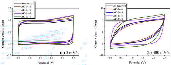 Figure 9 shows the cyclic voltammograms of AC measured at scan rates of 5 and 400 mV/s. In Figure 9a, all CV curves of AC exhibit an ideal rectangle shape, and no Faradic redox reaction is observed. This result indicates that all AC samples possess excellent pore characteristics—and, thus, exhibit ideal EDLC charge–discharge behavior—at a scanning rate of 5 mV/s, and that the redox reaction attributed to OFGs does not occur. Meanwhile, in Figure 9b, all CV curves of AC show a leaf shape because the resistance increased with the scan speed.