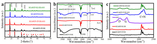 The XRD diffraction patterns of KCoHCP−CP, KCoHCP−CP−EK, KCoHCP−H2, KCoHCP−H2−EK, KCoHCP−CP−EK/5%rGO, and KCoHCP−H2−EK/5%rGO were shown in Figure 2a and Figure S4. The crystal planes of KCoHCP−CP and KCoHCP−H2 in (200), (220), (400), and (420) are consistent with those of previously reported KCoFe(CN)6 (PDF#75−0038) and these peaks are consistent with the reported PBA−like characteristic peaks [33,34]. Peaks of KCoHCP−CP−EK and KCoHCP−H2−EK appear on the crystal planes (110) and their crystal planes (200) and (220) increase and decrease slightly, respectively, which is similar to the overall peak pattern of Co3[Fe(CN)6]2 (PDF#46−0947) [37]. The results of XRD confirmed the success of the potassium removal scheme. Since the existing form of rGO was amorphous and the content of rGO may be relatively low, no new diffraction peaks were found of PBA/rGO.