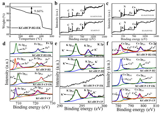 The analysis of thermogravimetric and surface chemical bonds: (a) The thermogravimetric curve of KCoHCP−H2−EK; (b–f) XPS spectras of KCoHCP−CP, KCoHCP−CP−EK samples and KCoHCP−H2, KCoHCP−H2−EK samples.