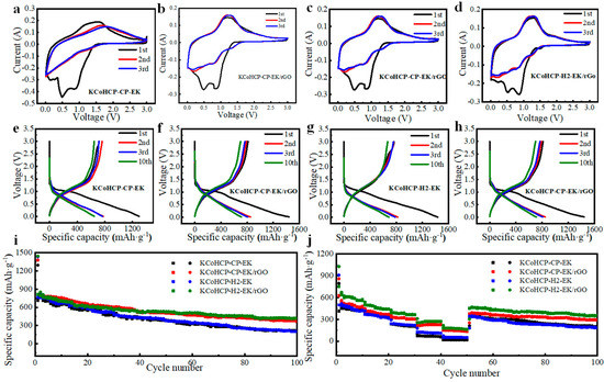Electrochemical characterization of KCoHCP−CP−EK and KCoHCP−CP−EK/rGO: (a–d) CV curves of KCoHCP−CP−EK, KCoHCP−CP−EK/rGO, KCoHCP−H2−EK, KCoHCP−H2−EK/rGO; (e–h) the charge/discharge curves of different samples after 1st, 2nd, 3rd, and 10th cycles; (i) charge/discharge cycle profiles of different sample at 0.1 A g−1; (j) capacity of different samples at various current densities of 0.1, 0.2, 0.5, 1 and 2 A·g−1.
