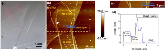 Representative AFM images of synthesized NBPS-CNMs. (a) Optical image, (b) AFM topography, (c) Magnified region, and (d) Height profile along the scan path defined in the magnified region. A folded bilayer CNM along the AFM scan path is defined by the height of the height line in blue color.