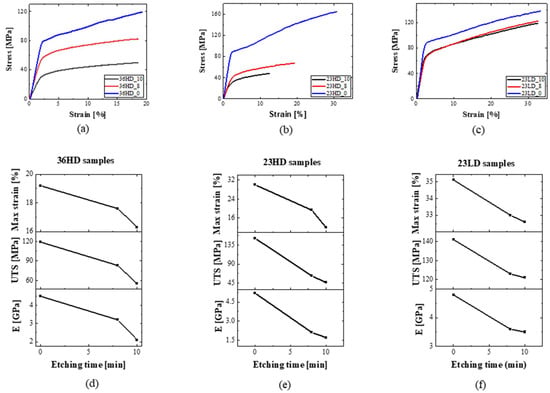 Characteristic stress–strain behavior of sample series (a) 36HD, (b) 23HD, and (c) 23LD. (d–f) Respective mechanical performance versus etching time.