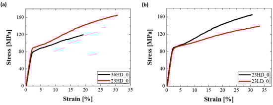 By observing Figure 7, it can be concluded that all three series of samples exhibited the characteristic mechanical behavior of polymers, i.e., demonstrated an elastic behavior at small strains followed by long plastic deformations at higher strains. The range of the observed engineering property values is of the same order of magnitude as of typical PET, i.e., ca. 100 MPa strength, 3.5 GPa Young’s modulus, and 20% failure strain. More specifically, the unetched specimens (series of samples with _0 suffix in the name) have, as expected, identical properties to pure PET with almost identical elastic regions and only slight differences in plastic behaviors. On the other hand, the tensile properties of the etched samples are found to downgrade with the substrate etching duration and, hence, also, pore size. Interestingly, the etched samples 23HD_10 and 23HD_8 present much inferior properties compared to 23LD_10 and 23LD_8, respectively. This occurs due to the increased etchant penetration into the higher porosity PET substrates, which, consequently, partakes in a higher volume of degradation of the composite.