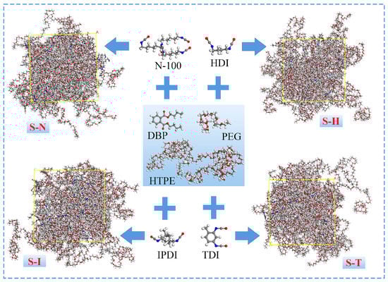In this paper, all molecular models and dynamic simulations were carried out by Materials Studio software, which could refer to the previous work []. The molecular structures of hydroxy-terminated polyether (HTPE), polyethylene glycol (PEG), polyfunctional isocyanate (N-100), hexamethylene diisocyanate (HDI), toluene diisocyanate (TDI), isophorone diisocyanate (IPDI), dibutyl phthalate (DBP) and four kinds of IPN models were displayed in Figure 1. Especially, the HTPE molecular chains were composed of polyethylene glycol and polytetrahydrofuran with a molar weight of 3974 g/mol. PEG400 molecules were the average of the PEG414 and PEG367 molecules. These polymers were built in the Builder Polymers module of Materials Studio.