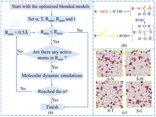 The flow chart of the crosslinking mechanism algorithm was shown in Figure 2a,b, which could be realized by MS through Perl scripts. The core idea was to increase the cutoff distances of efficient ranges between the special atoms of -OH groups and -NCO groups step by step to generate the crosslinking structures. Of course, there were some assumptions underlying these simulations. The equal chances of HTPE, PEG, DBP, N-100, HDI, TDI and IPDI molecular chains would be given to produce crosslinking structures. The -O-H and -N=C=O bonds broke and formed among reactive atoms, the of -NCO and -OH groups, when they met in the specified distance ranges. This algorithm would finish when it reached the maximum cutoff distance or the set conversation. Rather than putting the whole polyurethane into boxes directly, the random crosslinked structures based on atomic collision can really reflect the experimental samples. The reactive distance would increase from 3.5 Å to 14.5 Å with a ramp of 0.5 Å. The max conversion (α), system temperature (T), min reaction radius (Rmin), max reaction radius (Rmin) and other parameters could be reset flexibly.