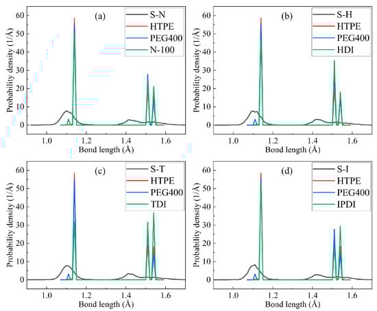 The formations of penetrating polymer networks made the polyurethane different from the linear pre-polymers such as structures and properties. The bond-length distributions of the prepolymers, curing agents and primary crosslinking structure binders, which eliminated the solvent, were measured and analyzed. According to the algorithm, the crosslinking structures were successfully established between the -OH groups of prepolymers and the -NCO groups of curing agents. The final crosslinking structures presented significant differences from the originally blended prepolymers, which resulted from the breaking and deformation of bonds between molecules. The bond-length distributions of four crosslinked polyurethane, prepolymers and curing agents were investigated with Monte Carlo sampling, and the many-body interaction models enable one to take into account more realistic atomic architecture models [,,]. The four systems showed little difference from each other in Figure 4 because all systems were composed of the same ratio of HTPE and PEG. Only a few different small molecular curing agents caused a little effect.