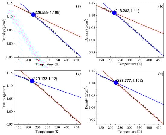 When the crosslinking models of IPN binders were established under the algorithm, the blended models needed to be sufficiently equilibrated and carried out molecular dynamic simulation under the NPT ensemble. The temperature decreased from 450 K to 150 K in 10-K intervals. One frame was output every 250 steps, and each temperature gradient contained 50 picoseconds for a total of 50,000 steps. The lowest energy frame was chosen to collect the physical parameters, such as density, volume and so on. All IPN binder models were well optimized; the glass transition temperature procedure was trained five times, and the average density of each model was taken to eliminate accidental errors. The density versus temperature relationships were fitted in Figure 5, and the discontinuity point was the glass transition temperature. For the thermosetting polymers, vitrification indicated a transformation from a liquid or rubbery state to a hard or glassy state [], and the molecules or atoms were mainly subject to vibration without translational and rotational motion at the glass transition temperature (Tg) []. Tg was a vital parameter to reveal the physical properties of polymer molecules and it was supposed to improve the mechanical properties of materials around Tg. From Figure 5, Tg from the S-N, S-H, S-T and S-I binder models were 226.59 K (−46.56 °C), 218.28 K (−54.87 °C), 220.13 K (−53.02 °C) and 227.78 K (−45.37 °C), respectively. All the simulations of Tg on the penetrating polymer structure models were lower than those of the pure HTPE and the pure PEG curing agent crosslinked models in our previous work [,]. The Tg of the S-H binder model was the lowest, and S-I showed the highest, which was due to the difference in curing agents. However, the HTPE prepolymers and plasticizer determined the performance of the binder matrix, and a few curing agents had an overlooked effect on the mechanical properties of IPN models. As a result, all curing models of IPN binders were kept at a similar glass transition temperature. The polyether and methylene content of the polyurethane soft parts led to low glass transition temperatures, and these binders were soft and flexible at room temperature [,]. The cooling rate of the procedure was higher than the scanning rate in the dynamic mechanical analyzer so the fitted Tg was slightly higher than the real ones [].