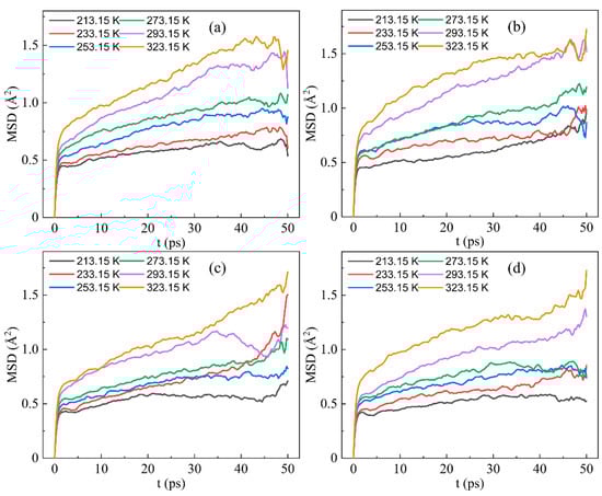 Mean squared displacement of four IPN binder models at 213.15 K, 233.15 K, 253.15 K, 273.15 K, 293.15 K and 323.15 K. (a) S-N, (b) S-H, (c) S-T and (d) S-I.
